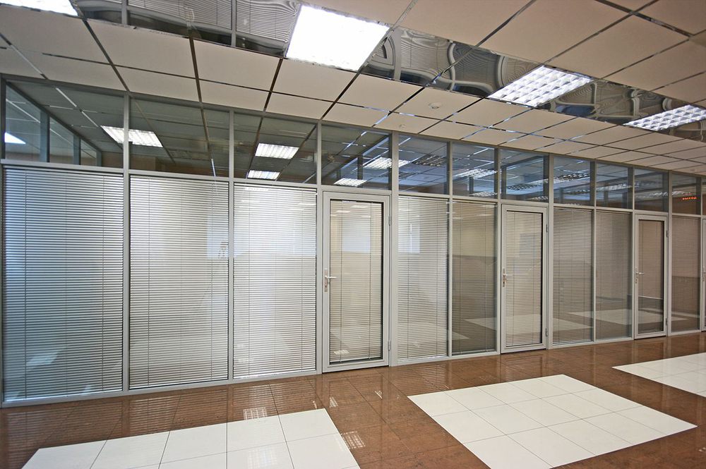 Перегородки могут быть полностью стеклянными или комбинированными — с глухим нижним импостом из ЛДСП, который повышает прочность конструкции и позволяет скрыть коммуникации. Часто используется и верхний прозрачный импост, увеличивающий освещённость коридоров при закрытых жалюзи.