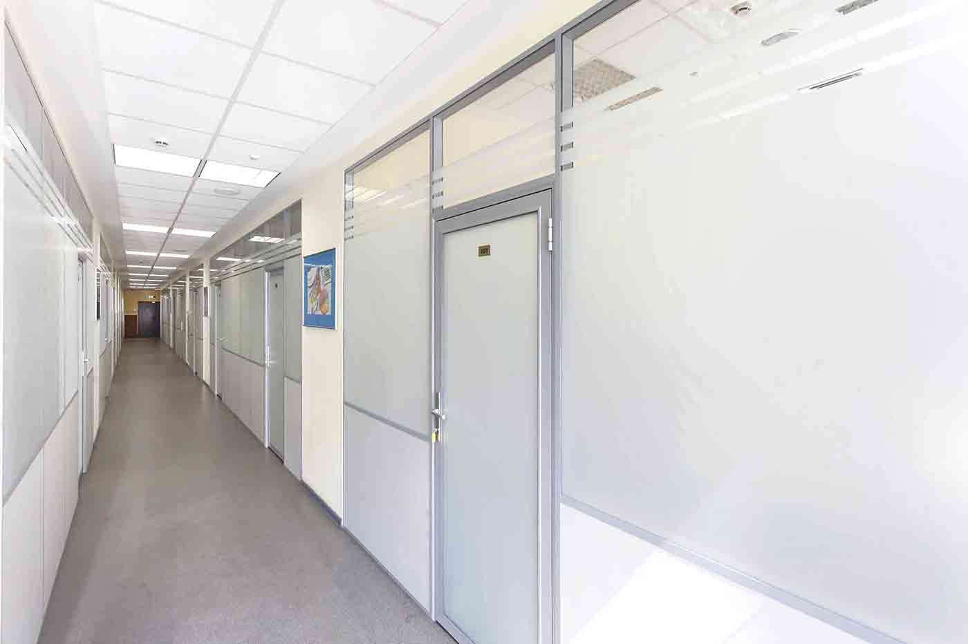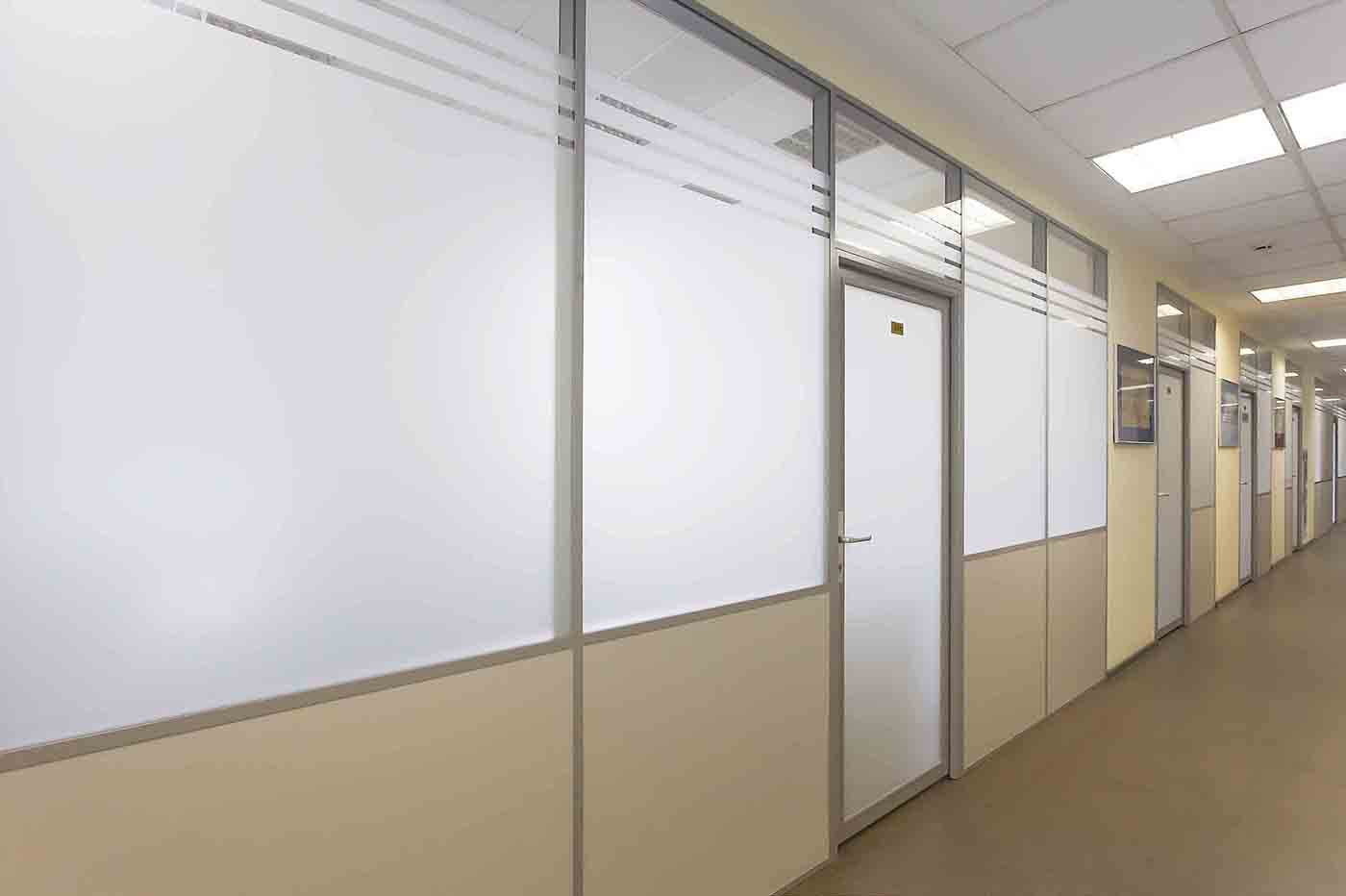 Матированное стекло позволяет визуально изолировать рабочие зоны, сохранив некоторый уровень освещенности зоны коридора.