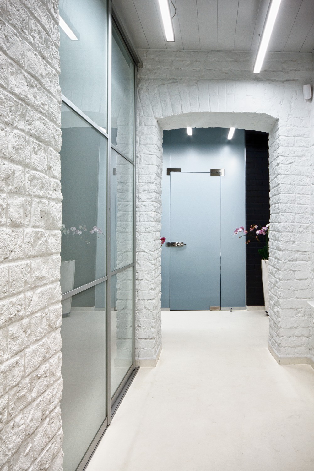 Изготовление и установка цельностеклянных офисных перегородок MSS Style прозрачных и матированных пленкой, монтаж дверей. В проекте использовались одностворчатые и двустворчатые двери из закаленного стекла.
